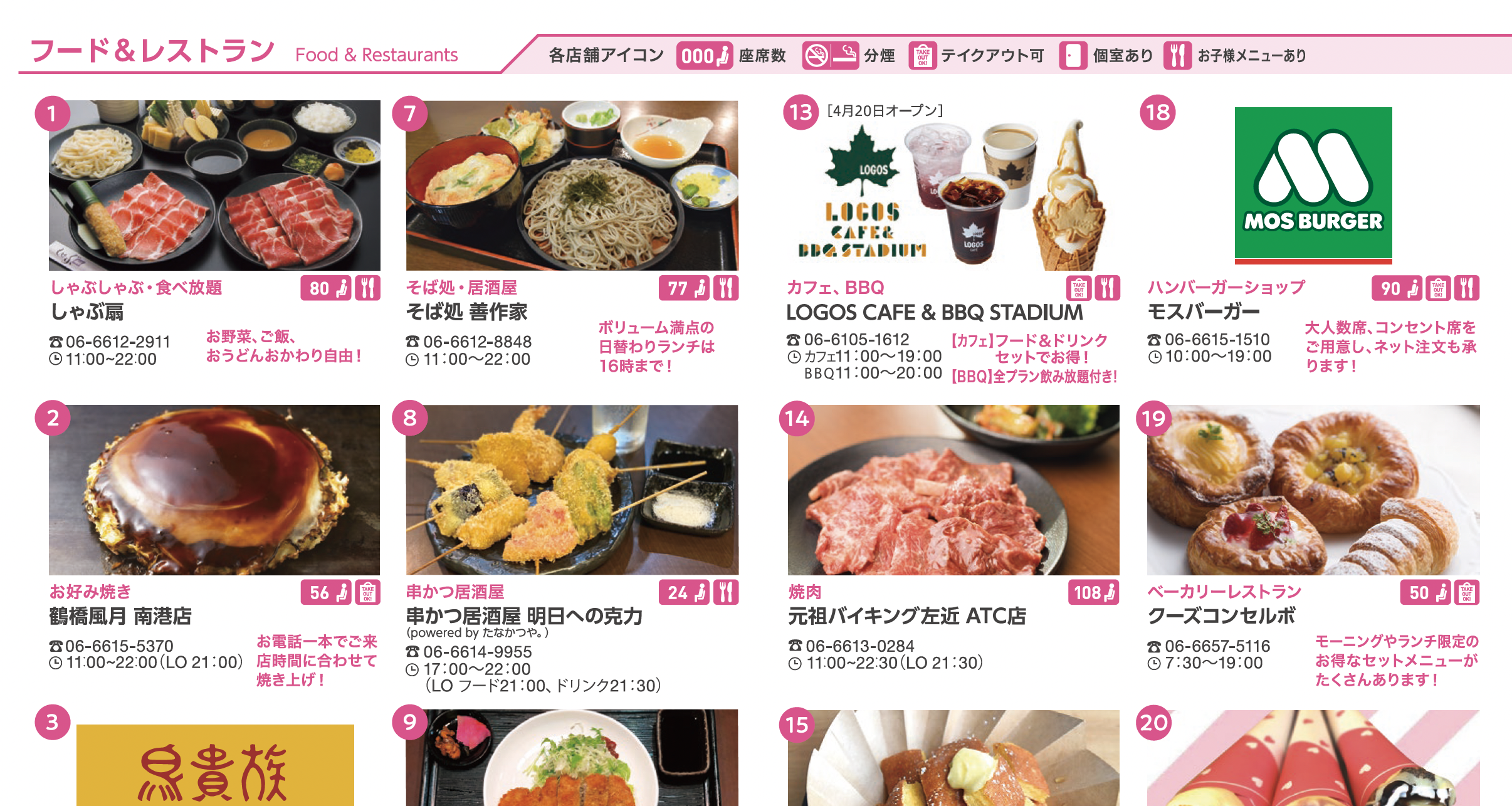 ATCフロアガイドマップ。飲食店と物販店が一目でわかるように、色と形を変えている。